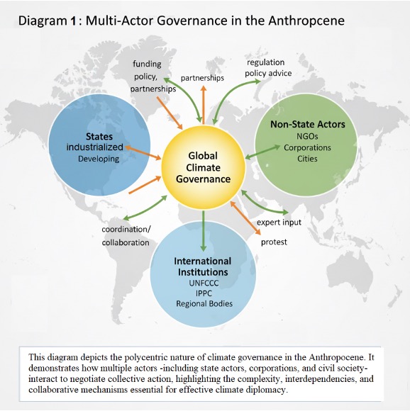 In the Anthropocene, climate change is not merely an environmental concern or an economic challenge; it is an existential political issue that tests the mechanisms of international cooperation. The interdependence of states, transnational institutions, non-governmental organizations, and private actors creates a highly complex governance landscape. States must balance competing objectives—economic growth, domestic political legitimacy, national security, and global reputation—while vulnerable nations face disproportionate climate impacts, raising critical questions of justice, equity, and historical responsibility. Consequently, climate diplomacy emerges as a crucial arena in which survival, fairness, and collective action are negotiated simultaneously, bridging the divide between scientific urgency and political feasibility.