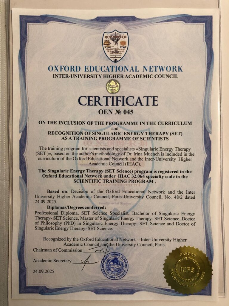 The training program for scientists and specialists “Singularic Energy Therapy (SET )”, based on the author’s methodology of Dr. Irina Muench is included in the curriculum of the Oxford Educational Network and the International Higher Academic Council (IHAC).