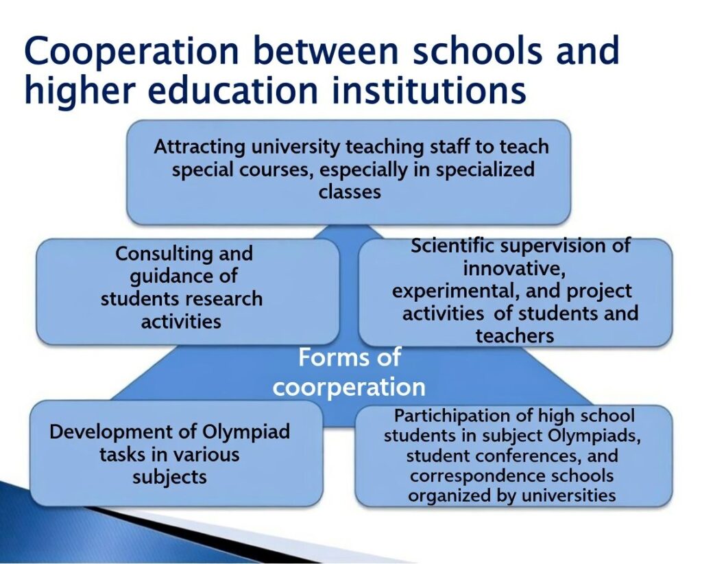 Partnerships between schools and universities are built on the basis of a mutually beneficial exchange of resources, experience and knowledge. Educational institutions jointly develop methodologies, programmes and teaching materials, as well as introduce innovative forms of teaching that ensure the adaptation of content to modern requirements. Against this backdrop, the collective roles of teachers and students are developing, in particular through cooperation in organising events and jointly managing educational projects, which stimulates communication and professional interaction [4][8].